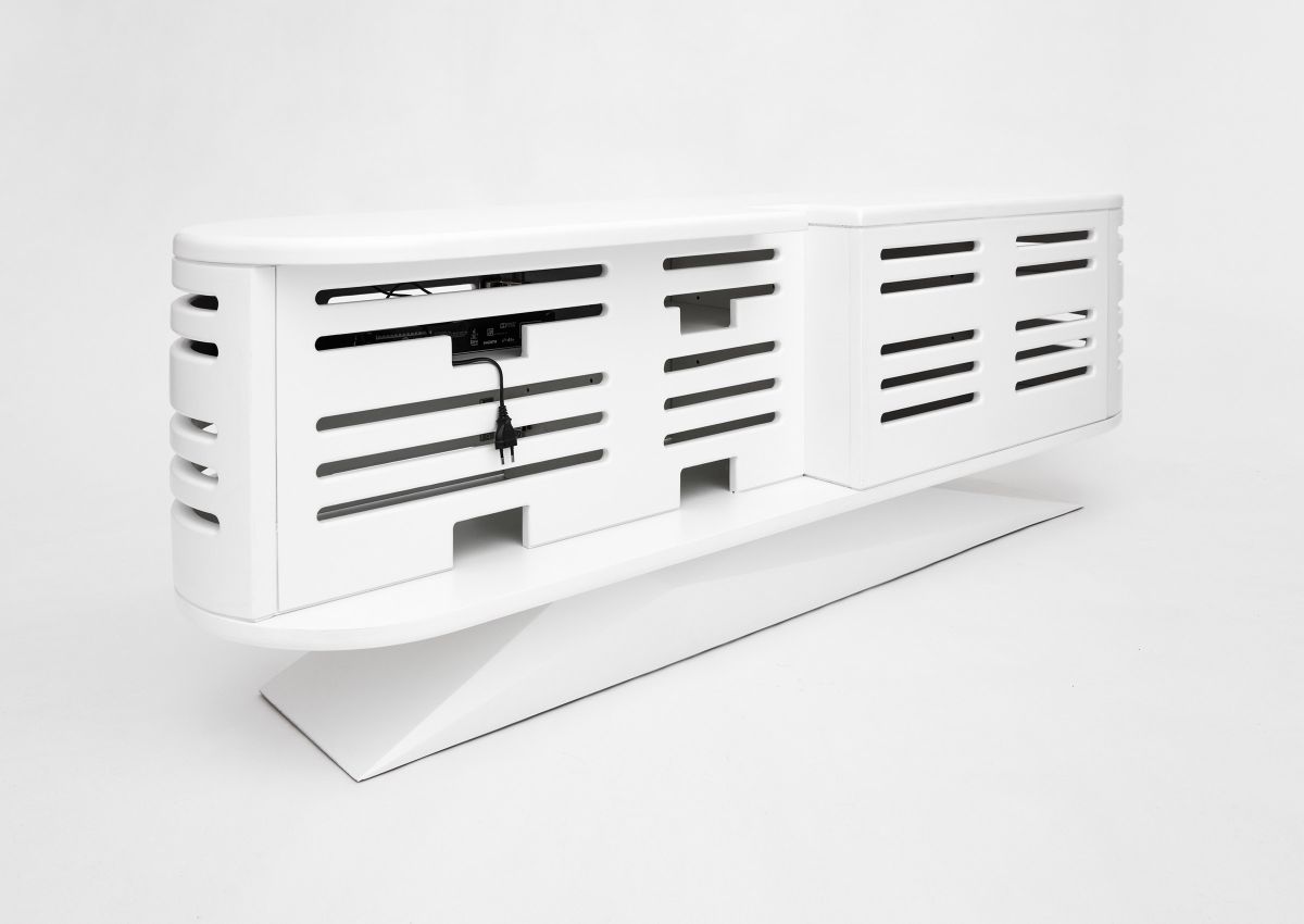 The "Balance" media sideboard stands for permeability, openness, filtering and, of course, balance. The heavy body, open with many slits, stands asymmetrically on a plinth sloping in all directions, giving the impression of floating slightly in space. Symbolically, balance stands for the absorption of information, how we filter it and how we assign it.
