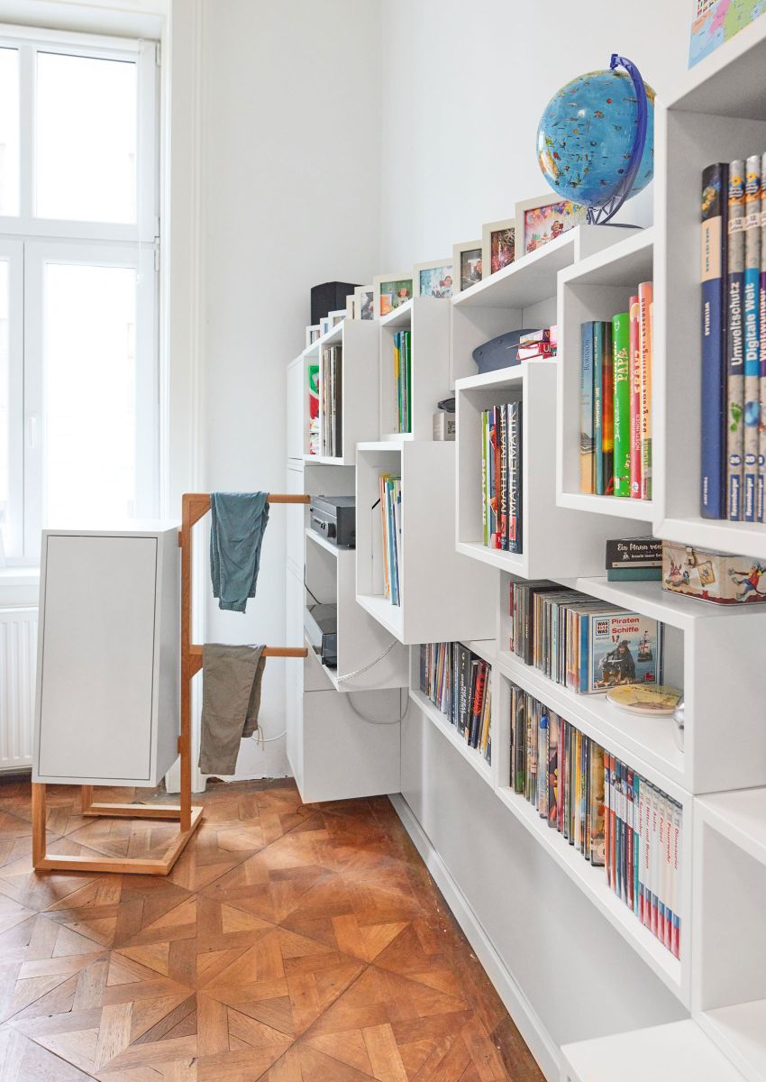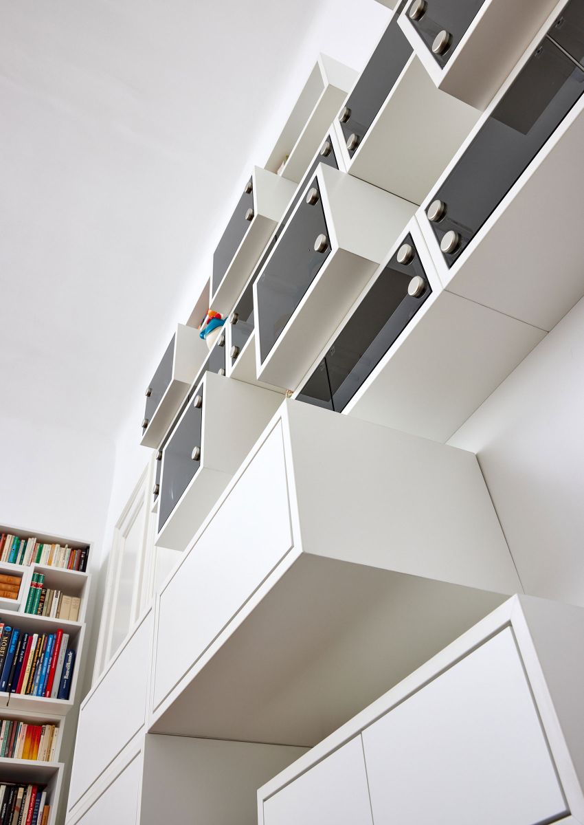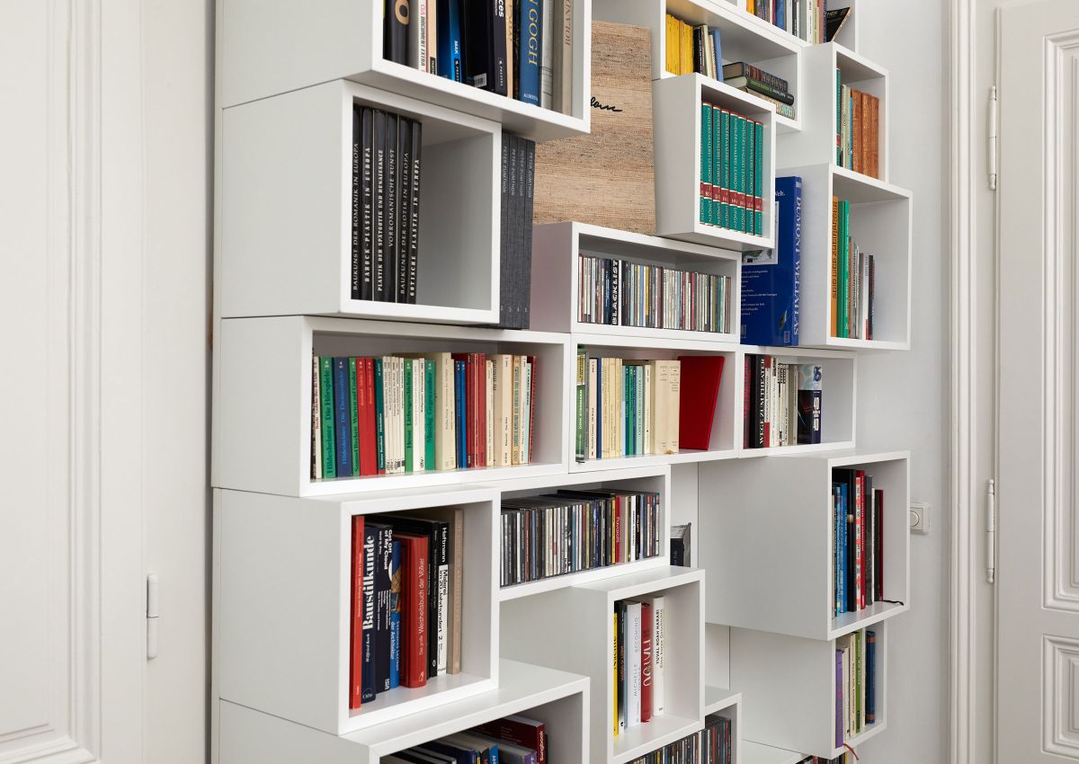 whether tall, small, thick, thin, long, tall, whether prose, novel, crime novel, illustrated book, specialist literature, everything finds its cut and assigned individual place in the hanging pile. This diversity creates a 3-dimensional spatial element, which never touches the floor, but is always hung as a wall element on existing walls or walls created especially for this purpose, thus suggesting the impression of being stacked.