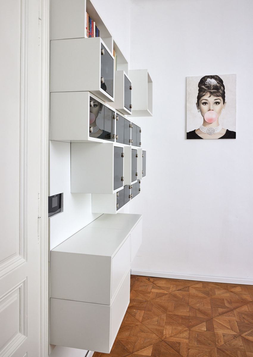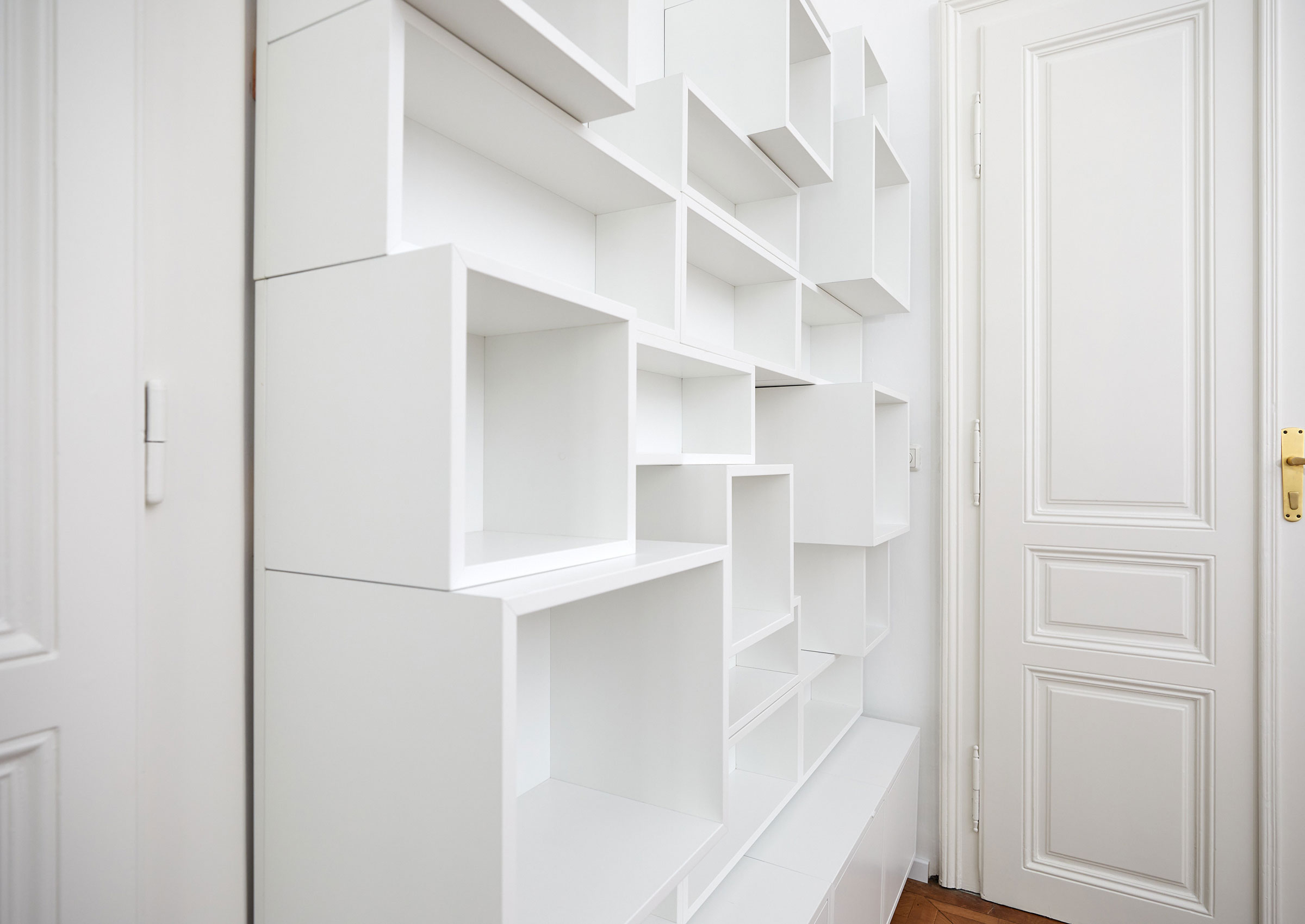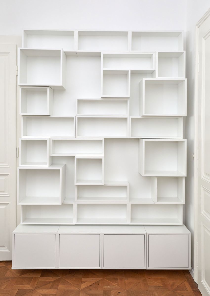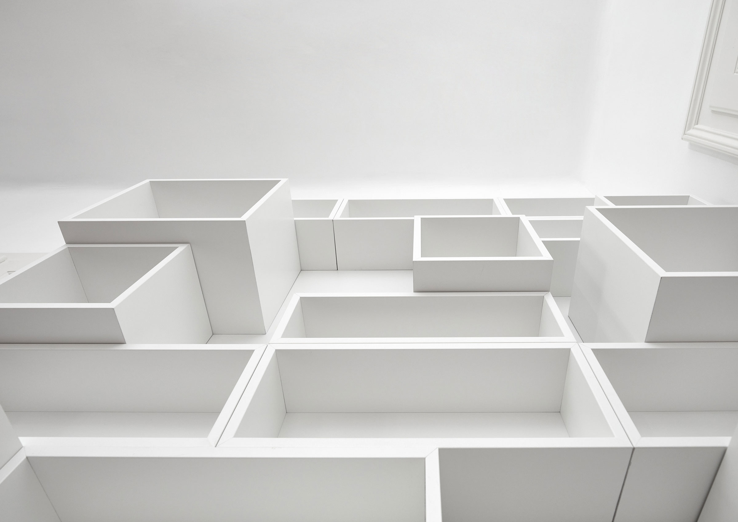 Aus dieser Vielfältigkeit entsteht ein 3 dimensionales Raumelement, welches den Boden nie berührt, sondern immer nur als Wandelement auf bestehende oder extra dafür geschaffenen Wänden, aufgehängt wird und so den Eindruck des gestapelt seins, suggeriert.