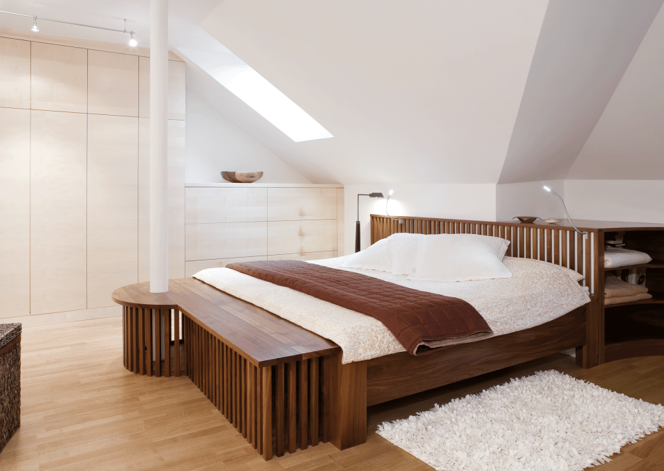 The bed, as a tribute to J. Hoffmann, plays around the column at the foot end and nestles below the sloping roof in such a way that there is no impairment for the use of the bed.