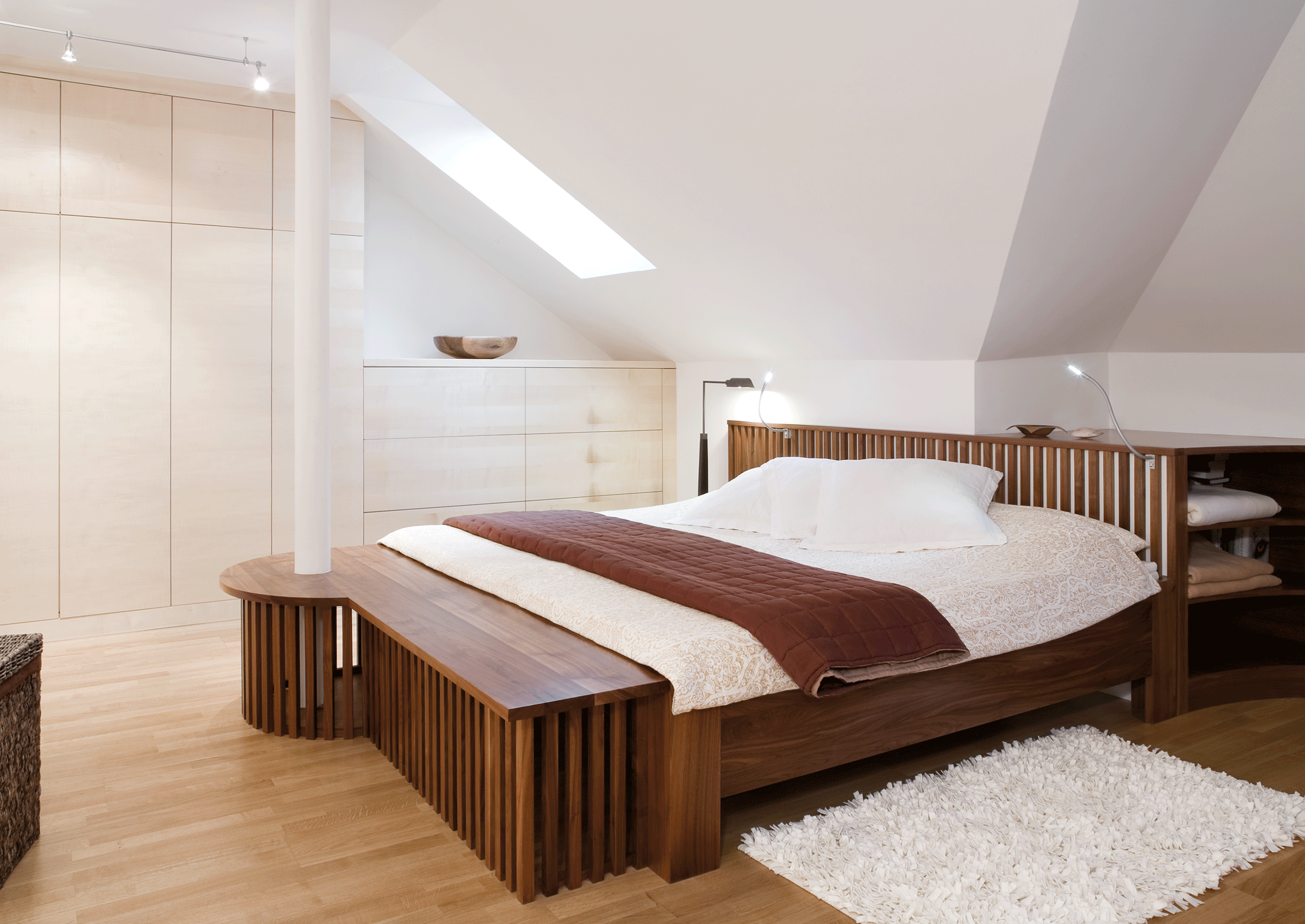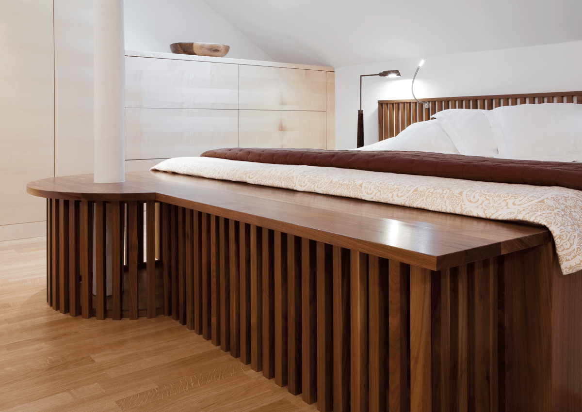 Das Bett, als Hommage an J. Hoffmann, umspielt am Fußende die Säule und schmiegt sich unterhalb der Dachschrägen so ein, dass es keine Beeinträchtigung für die Benutzung des Bettes gibt.