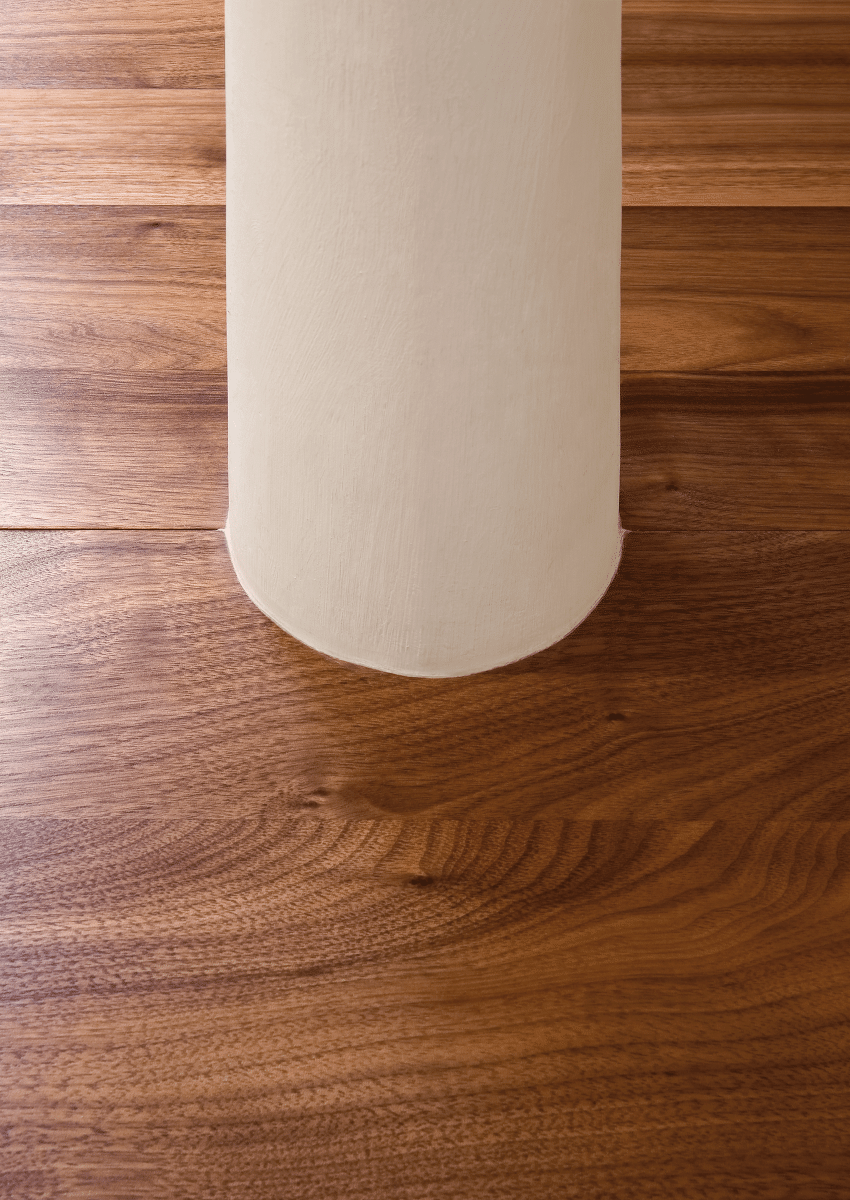 Der Wandschrank verschmilzt am Ende des Raumes mit der Wandnische und bildet so ein harmonisches Rückgrat.