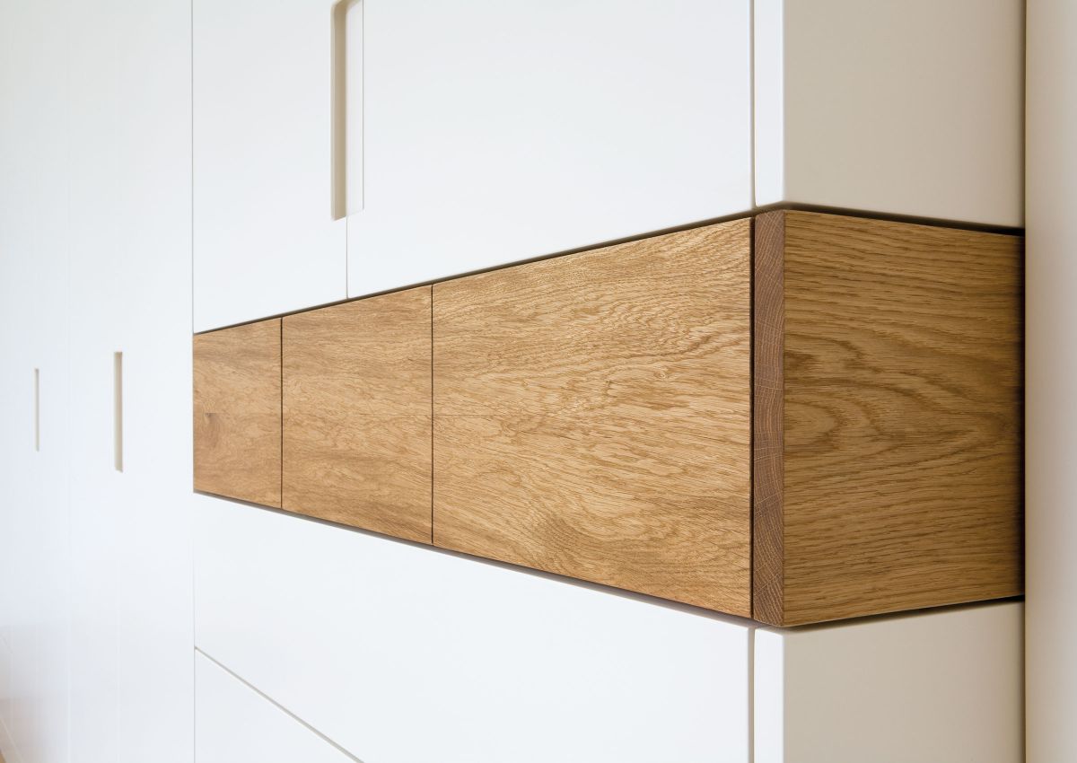 an oak brushstroke on the creamy white canvas characterizes the bedroom, which is at peace with itself.